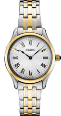 From the Essentials Collection. Offering classic dress/sport designs, in two sizes to suit anyone’s personal style, the Essentials Collection provides the ideal solution for everyday wear. Crafted of stainless steel in a versatile two-tone finish, this sophisticated design features a silver dial with elegant Roman numerals and finely shaped hands. Includes a classic cabochon crown, scratch-resistant sapphire crystal and tri-fold push button release clasp. 5 bar, 50M Water Resistant