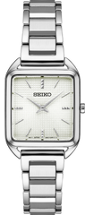 From the Essentials Collection. With a fresh square case design, this light and slim watch is proportioned for a perfect fit. The silver-white die-stamped grid pattern dial and subtly textured markers add a hint of sophisticated luxury. Crafted of stainless steel with tri-fold push button release clasp. 5 bar, 50M Water Resistant