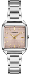 From the Essentials Collection. With a fresh square case design, this light and slim watch is proportioned for a perfect fit. The contemporary muted mauve pink die-stamped grid pattern dial and subtly textured markers add a hint of sophisticated luxury. Crafted of stainless steel with tri-fold push button release clasp. 5 bar, 50M Water Resistant