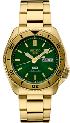 Seiko 5 sports series model SRPJ20. Japanese made Seiko 4R36 automatic movement with day/date function. Stainless steel case and bracelet with gold tone PVD coating. Uni-directional bezel with 60 minute scale. Green dial with LumiBrite hands and markers. Water resistant to 100 meters. Limited Edition of 300 pieces Worldwide.