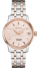 Seiko Presage Cocktail Time. Offering the finest in Japanese mechanical watchmaking, the Presage Collection blends precision technology with superior craftsmanship and design. Offering a feminine twist to the popular Cocktail theme line, this charming watch, inspired by the Pink Champagne cocktail, features a pink dial with a pressed pattern evoking crushed ice and a sugar garnish. The 23-jewel movement, with manual and automatic winding capability, beats at a frequency of 21,600 vibrations per hour, with a power reserve of approximately 41 hours. Crafted of stainless steel with rose-gold two-tone finish, this distinctive timepiece includes a calendar, box-shaped crystal, screwdown see-through caseback, and tri-fold push button release clasp. 5 bar, 50M Water Resistant