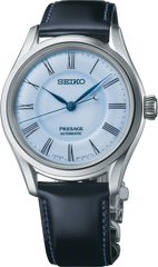 Presage Craftsmanship Series Arita Porcelain. Offering the finest in Japanese mechanical watchmaking, the Presage Collection blends precision technology with superior craftsmanship and design. Arita porcelain, prized for its unique blue and white colors, is among the classic expressions of Japanese artistry showcased in the Presage Craftsmanship Series, used to create high-strength, three-dimensional dials, individually crafted by master artisans in a multi-step process combining technical innovation with centuries of inspiration. In Rurizome (pale blue), the elegant Roman numeral dial is uninterrupted by subdials or inserts to showcase the beauty of the porcelain. The 24-jewel automatic movement beats at a frequency of 21,600 vibrations per hour with a power reserve of approximately 70 hours and offers manual winding capability. Crafted of stainless steel, this exquisite watch includes a dual-curved anti-reflective sapphire crystal, black cordovan leather strap, and tri-fold push-button release clasp. 5 bar, 50M Water Resistant