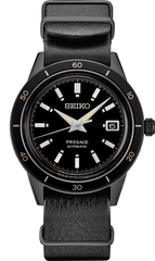 Presage Style60's Collection. Offering the finest in Japanese mechanical watchmaking, the Presage Collection blends precision technology with superior craftsmanship and design. With broad angular lines and such vintage details as box-shaped crystals, faceted indices and sharp hand design, plus the use of neutrals and earth tones, the Style60's collection creates a warm, retro feel. Celebrating the fresh spirit of the 1960s, the collection takes particular inspiration from Seiko’s 1964 “Crown Chronograph,” Japan’s first watch with a stopwatch function. Framed by a black bezel, the black dial of this dramatic timepiece features a date calendar, as well as beige LumiBrite hands and markers. The screwdown see-through caseback provides a view of the 23-jewel movement with manual winding capability, a frequency of 21,600 vibrations per hour and a power reserve of approximately 41 hours. Crafted of stainless steel with black hard coating, this exceptional watch includes a black deerskin strap, and a box-shaped crystal. 5 bar, 50M Water Resistant