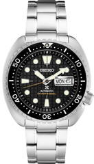 Prospex Automatic Diver. Designed for those who treat life as the ultimate adventure, the Seiko Prospex line meets every challenge with technological excellence and winning design. Upgrading an iconic style with a ceramic bezel and a sapphire crystal with anti-reflective coating on the inner surface, this rugged, yet distinctive, timepiece offers a three-dimensional pressed pattern on the rich black dial, mirroring the shape of the bezel edge. LumiBrite hands and markers, and a magnified day/date window ensure legibility in rough conditions. The 24-jewel automatic movement beats at a frequency of 21,600 vibrations per hour, with a power reserve of approximately 41 hours, and can be wound manually or automatically. In stainless steel, with black ceramic one-way rotating elapsed timing bezel, secure screwdown crown and caseback, this high-intensity watch follows ISO standards for scuba diving. 200m Water Resistant