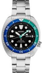 Prospex Special Edition Diver's Watch. Designed for those who treat life as the ultimate adventure, Seiko Prospex keeps moving forward, meeting every challenge with technological excellence and winning design. Inspired by the colors of a tropical lagoon, this vibrant Special Edition features marine blue and green accents on its uni-directional rotating elapsed timing bezel, echoed by the green minute hand and accents on the black dial. The 24-jewel automatic movement beats at a frequency of 21 600 vibrations per hour, with a power reserve of approximately 41 hours, and offers manual winding capability. Based on an iconic Seiko design, this rugged and stylish watch follows ISO standards for scuba diving at depths of up to 200 meters. Crafted of stainless steel, with screw-down crown and caseback, date calendar, LumiBrite hands and markers, and tri-fold push button release clasp with secure lock and extender. 200m Water Resistant