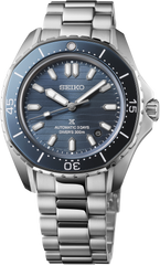 Prospex Automatic Diver’s Watch. Designed for those who treat life as the ultimate adventure, the Seiko Prospex collection meets every challenge with technological excellence and style, continuing the rich legacy of innovation in high-intensity timekeeping. Framed by a coordinating polygonal uni-directional rotating elapsed timing bezel, suited for formal occasions while keeping an active and sporty impression, the warm blue pressed pattern dial, inspired by a calm coastline, offers a date calendar between 4 and 5 o’clock allowing for LumiBrite coating on the hands and all 12 markers, improving symmetry and legibility. With an upgraded power reserve of approximately 72 hours, 3 full days, the 24-jewel automatic movement beats at a frequency of 21,600 vibrations per hour and features manual winding capability. Crafted of stainless steel with super-hard coating, this superbly functional diver’s watch includes a sapphire crystal with anti-reflective coating on the inner surface, as well as a screwdown crown and caseback. The bracelet is designed with mirror polish center links to match the sophisticated case design, which follows ISO standards for scuba diving to depths of 300 meters while maintaining a slim profile. Water Resistant
