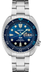 Prospex PADI Special Edition. Designed for those who treat life as the ultimate adventure, Seiko Prospex keeps moving forward, meeting every challenge with technological excellence and winning design. This stunning Special Edition celebrates Seiko’s official partnership with PADI, the world’s leading scuba diver training operation, particularly in the distinctive patterned and gradated blue dial reflecting the surface of the ocean as seen from under water as the sunlight reaches through the waves on the surface. With a magnified day/date calendar, the dial also features LumiBrite hands and markers with a unique blue glow recalling signature PADI colors, while vibrant blue accents on the blue ceramic uni-directional rotating elapsed timing bezel continue the PADI theme. Following ISO standards for scuba diving, this exceptionally durable timepiece offers a rugged stainless steel case and bracelet based on one of Seiko’s most iconic diving styles, screwdown crown and caseback, sapphire crystal with anti-reflective coating on the inner surface, and a tri-fold push button release clasp with secure lock and extender. For reliable timing in rough waters, the 24-jewel automatic movement beats at a frequency of 21,600 vibrations per hour, with a power reserve of approximately 41 hours, and offers manual winding capability. 200m Water Resistant