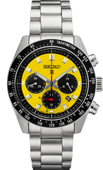 Prospex Speedtimer Solar Chronograph U.S. Special Edition. Designed for those who treat life as the ultimate adventure, the Seiko Prospex line meets every challenge with technological excellence and style. With vibrant colors inspired by vintage racing cars, this exciting Special Edition celebrates the 1969 “Speedtimer,” the world's first self-winding chronograph. The chronograph function measures up to 60 minutes of elapsed time in 1/5-second increments and includes a split time function, while the solar cell, powered by any light source, with no battery change required, provides a 6-month power reserve when fully charged. Framed by a black tachymeter ring, the bright yellow dial features three black subdials, including 24-hour and power reserve indicators, a date calendar, and LumiBrite hands and markers. Crafted of stainless steel with tri-fold push button release clasp, and curved sapphire crystal with anti-reflective coating on the inner surface. 10 bar, 100M Water Resistant