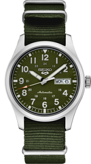 Seiko 5 Sports. Inspired by classic field/military design, this stylishly retro watch offers authentic lines with both durability and all-day excellence. Providing automatic technology that you control with every movement, this versatile watch is powered by a 24-jewel movement that beats at a frequency of 21,600 vibrations per hour, with a power reserve of approximately 41 hours and manual winding capability. The green dial features Arabic numerals, a day/date calendar, red-orange tipped second hand, and luminous hands and markers. Crafted of stainless steel with green nylon strap and a screwdown see-through caseback for a view of classic timekeeping in action. 10 bar, 100M Water Resistant
