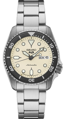 Seiko 5 Sports SKX Mid-Size. With vintage styling and colors recalling the quartz diver’s watches of the 1980s, the mid-size SKX design offers the 38mm case diameter of the originals, but with a slimmer case and a durable, yet comfortable, three-row sport bracelet. Providing automatic technology that you control with every movement, this dynamic timepiece is powered by a 24-jewel movement that beats at a frequency of 21,600 vibrations per hour, with a power reserve of approximately 41 hours and manual winding capability. The ivory dial, framed by a dark gray uni-directional rotating elapsed timing bezel, features a day/date calendar and luminous hands and markers. In stainless steel, with locking tri-fold push button release clasp and a screwdown see-through caseback for a view of classic timekeeping in action. 10 bar, 100M Water Resistant