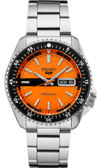 Seiko 5 Sports Special Edition. Inspired by the popular model 5126-6030 of the late-'60s, this dynamic watch offers current styling with a vintage feel, featuring an updated case and streamlined dial, while retaining the original's orange and black color scheme. Framed by a black uni-directional rotating bezel, the orange dial includes a day/date calendar, red-orange second hand, black stripe accent, and luminous hands and markers. Providing automatic technology that you control with every movement, the 24-jewel movement, visible through the screwdown see-through caseback, beats at a frequency of 21,600 vibrations per hour, with a power reserve of approximately 41 hours and manual winding capability. In stainless steel with locking tri-fold push button release clasp. 10 bar, 100M Water Resistant