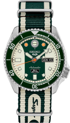 Seiko 5 Sports Honda Cub Limited Edition. Created in collaboration with Super Cub, Honda's urban motorbike and partner, this exciting Limited Edition, available only in a controlled production run of 6,000, expresses the essence of this world-renowned bike. The dial, in white and the Cub's most popular green, features a 12 o'clock marker representing the headlight, with red 1 and 11 o'clock indices suggesting the blinkers. Other unique details include a fuel gauge design on the crown and the 30km/hour speed limit on the green uni-directional rotating bezel, as well as a green and white nylon strap that can be worn over clothing in biker style. The dial also features a day/date calendar, and luminous hands and markers. Providing automatic technology that you control with every movement, this unique timepiece is powered by a 24-jewel movement that beats at a frequency of 21,600 vibrations per hour, with a power reserve of approximately 41 hours and manual winding capability, visible through a screwdown, see-through caseback displaying the Honda Super Cub logo. Crafted of stainless steel, this exceptional design is packaged in a Limited Edition collectors' box. 10 bar, 100M Water Resistant