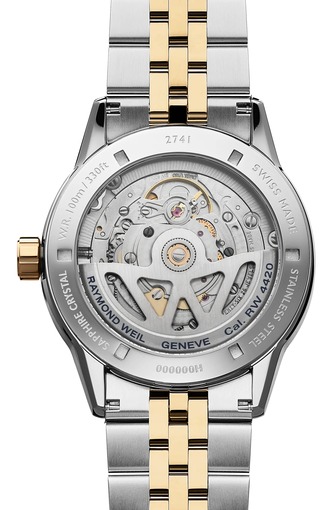 The two-tone bracelet, fitted with a double-push folding clasp, offers both comfort and security. A screwed-down crown embossed with the RW monogram and a transparent sapphire caseback reveal the automatic movement within, showcasing the W-shaped oscillating weight—a distinctive signature of the brand. Water-resistant up to 100 meters, this timepiece embodies both performance and elegance.