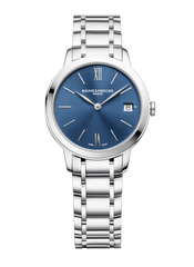 Featuring a sun-satin finished blue dial with Roman numerals at 6 and 12 o’clock, this ladies quartz watch reflects the refined taste of the wearer. The chic design of the dial is balanced by a stainless steel bracelet and matching watch case.