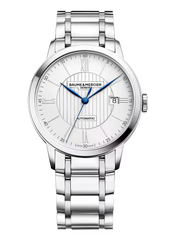 The Classima 10215 watch for men features the modern appeal of stainless steel combined with a sophisticated design. A steel bracelet, polished steel 40 mm round case, blue hands, and a silver dial, styled with the iconic Baume et Mercier line guilloché décor and Roman number hour markers make this steel automatic watch for men a popular choice for those who appreciate the aesthetic quality and strength of the most durable metal.