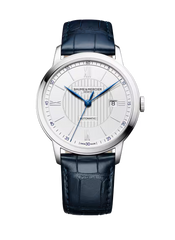 Blued steel hands sweep around the opaline silver-colored dial, styled with line guilloché décor and Roman numerals, in this Swiss-made timepiece. The Classima 10333 is a men’s automatic watch designed with masculine refinement in mind. The blue leather strap with an alligator pattern perfectly balances the clean lines and smooth appearance of the watch face. Glimpse the mechanical self-winding movement from behind the clear sapphire case back.
