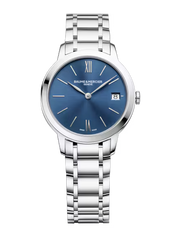 Featuring a sun-satin finished blue dial with Roman numerals at 6 and 12 o’clock, this ladies quartz watch reflects the refined taste of the wearer. The chic design of the dial is balanced by a stainless steel bracelet and matching watch case.