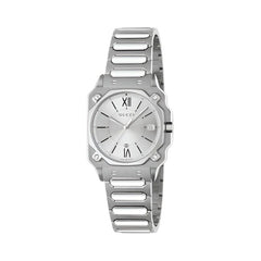 First introduced in the 1970s, the G-Flat watch pays homage to the heritage designs of the House with a modern touch. Characterized by octagonal angles and a multi-layered profile, the watch evokes the architectural landscape of the 1970s. This watch appears in stainless steel with silver galvanized dial, roman indexes and date opening.