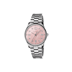 The season's polished look extends to watches and jewelry, including the G-Timeless collection. The round watch spotlights a sleek dial finish with subtle expressions of the Interlocking G and the Gucci lettering. Designed with a pink mother of pearl dial, the accessory is further enriched with signature motifs of the House.