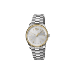 The season's polished look extends to watches and jewelry, including the G-Timeless collection. The round watch spotlights a sleek dial finish with subtle expressions of the Interlocking G and the Gucci lettering. Designed with a silver dial, the accessory is further enriched with signature motifs of the House.