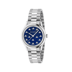 The Gucci bee, a historical symbol from the '70s archives, is combined with a dark blue lapiz stone dial and a steel bracelet. The G-Timeless collection combines classic design details with a contemporary aesthetic to create elevated watches with a timeless feel.