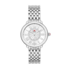 This Serein Mid Stainless Steel Diamond Dial Watch shines with 46 hand-set diamonds along the inner ring of silver sunray dial. Paired with a stainless steel seven-link bracelet, this 16mm bracelet is made specifically for the Serein Mid and is interchangeable with any 16mm MICHELE strap.