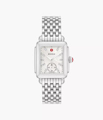 Inspired by the geometric shapes of Art Deco architecture, the Deco Mid timepiece embodies clean, sophisticated style. The mother-of-pearl dial is adorned with diamond hour markings and the signature MICHELE crown accent this stunning timepiece. The stainless bracelet is interchangeable with any 16mm MICHELE strap.