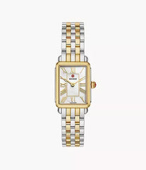 Elegant and architectural, this rectangular watch from the Deco Park collection perfectly balances form and function. The glossy white mother-of-pearl dial is housed within a two-tone stainless steel and 18K gold-plated case and Swiss movement. The two-tone 18K gold-plated bracelet is made specifically for the Deco Park collection and is interchangeable with any 14mm MICHELE strap.