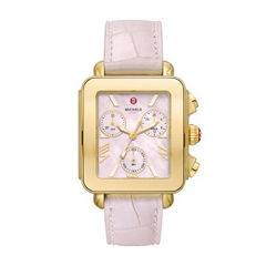 This 18K gold-plated Deco Sport Chronograph offers a sporty, more casual take on the classic Deco with a peony mother of pearl dial with lum-filled stick indexes, and gold-tone case with a matching iridescent croco pattern leather strap. The 18mm is made specifically for the Deco Sport collection and is interchangeable with any 18mm MICHELE strap.
