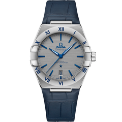 The dramatic and enduring design of the OMEGA Constellation is characterised by its famous half-moons, as well as the “claws” on the side of the caseThis 39 mm stainless steel model features a bezel with blued Roman numerals, a deep horizontally-brushed ruthenium-grey dial and a date window at the 6 o'clock position The hands, OMEGA logo, Constellation star and indexes are all bluedPresented on a blue leather strap, this timepiece is driven by the OMEGA Co-Axial Master Chronometer Calibre 8800, visible through the domed scratch-resistant sapphire crystal