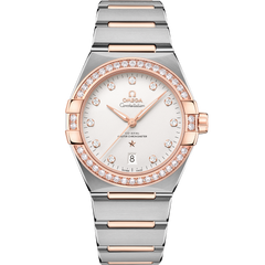 The dramatic and enduring design of the OMEGA Constellation is characterised by its famous half-moons, "claws" on the case and mono-rang bracelet This 39 mm stainless steel and 18K Sedna™ gold model features a diamond-paved bezel, an opaline silvery dial with diamond hour-markers and a date window at the 6 o'clock position The hands, OMEGA logo, Constellation star and diamond-holders on the dial are all in 18K Sedna™ gold At the heart of this timepiece is the OMEGA Co-Axial Master Chronometer Calibre 8800, visible through the domed scratch-resistant sapphire crystal