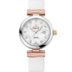 When the Ladymatic first appeared in 1955, it became a defining timepiece in women's fashion Six decades on, it still retains every ounce of captivating style and grace In this model, the stainless steel case is enhanced by 18K Sedna™ gold waved links, connecting it to a white leather strap Sedna™ gold also features on the polished alpha-shaped hands, as well as 11 indexes, which are set with diamonds The attractive dial is made with white, mother-of-pearl, to accentuate the feminine touch Days are tracked by a date window at 3 o'clock, while the inner body includes the OMEGA Co-Axial calibre 8520