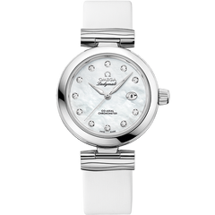 When the Ladymatic first appeared in 1955, it became a defining timepiece in women's fashion Six decades on, it still retains every ounce of captivating style and grace In this model, the stainless steel case is enhanced by waved links, connecting it to a white leather strap The polished alpha-shaped hands have been crafted with white gold, along with 11 indexes, which are set with diamonds The attractive dial is made with white mother-of-pearl, to accentuate the feminine touch Days are tracked by a date window at 3 o'clock, while the inner body includes the OMEGA Co-Axial calibre 8520