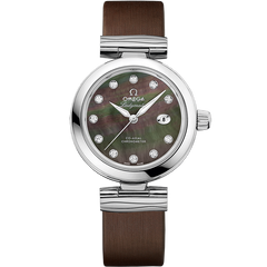 When the Ladymatic first appeared in 1955, it became a defining timepiece in women's fashion Six decades on, it still retains every ounce of captivating style and grace In this model, the stainless steel case is enhanced by waved links, connecting it to a brown grey leather strap The polished alpha-shaped hands have been crafted with white gold, along with 11 indexes, which are set with diamonds The attractive dial is made with Tahiti mother-of-pearl, to accentuate the feminine touch Days are tracked by a date window at 3 o'clock, while the inner body includes the OMEGA Co-Axial calibre 8520