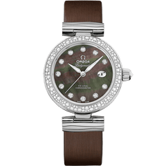 When the Ladymatic first appeared in 1955, it became a defining timepiece in women's fashion. Six decades on, it still retains every ounce of captivating style and grace. In this model, the stainless steel case is enhanced by waved links, connecting it to a grey leather strap. The polished alpha-shaped hands have been crafted with white gold, along with 11 indexes, which are set with diamonds. Radiating around the Tahiti mother-of-pearl dial, the bezel is also paved with snow-set diamonds, and an extra "Brilliant OMEGA cut" diamond has been placed within the polished crown. Days are tracked by a date window at 3 o'clock, while the inner body includes the OMEGA Co-Axial calibre 8520.