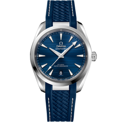 The Seamaster Aqua Terra is a superb tribute to OMEGA’s rich maritime heritage. In this 38mm model, the symmetrical case has been crafted from stainless steel, with a wave-edged design featured on the back. The blue dial is sun-brushed and is distinguished by a horizontal “teak” pattern which is inspired by the wooden decks of luxury sailboats. There is also a date window at 6 o'clock and rhodium-plated hands and indexes filled with white Super-LumiNova. The blue strap is made from structured rubber and includes grey lining and an additional stainless steel link which integrates it to the case. This certified chronometer is powered by the OMEGA Master Chronometer calibre 8800, certified at the industry’s highest standard by the Swiss Federal Institute of Metrology (METAS).