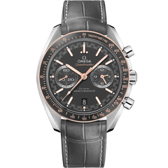 Presented on a grey leather strap, this Speedmaster Racing Master Chronometer model features a 44.25 mm stainless steel case with an 18K Sedna™ gold bezel. The silicon nitride bezel ring includes the famous tachymeter scale in OMEGA Ceragold™. On the matt grey dial, there is a distinctive racing style minute-track which gives the watch its name. There are also two subdials with rhodium plated applied rings as well as a 6 o’clock date window that blends with the colour of the dial. The hour and minute hands and arrowhead indexes are 18K Sedna™ gold with white Super-LumiNova. The watch is driven by the OMEGA Co-Axial Master Chronometer 9900, certified by METAS at the industry’s highest standard.