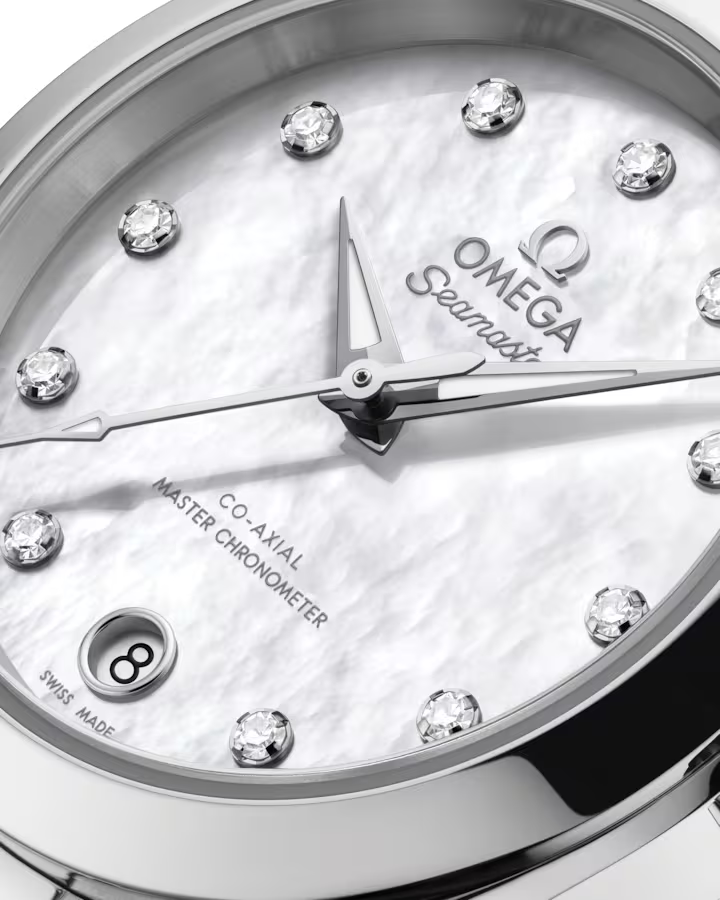 The white mother-of-pearl dial is in full glossy finish, with a circular date window at 6 o’clock. It is highlighted by 11 diamond hour markers and redesigned faceted hands, with the minute hand tapering to a delicate point. All the applied elements and hands are in 18K white gold, while the hands are also filled with white Super-LumiNova which emits a blue glow.