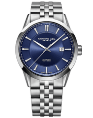 Equipped with an automatic winding movement housed in a 42mm case, this timepiece features a captivating and elegant blue dial with a date function at 3 o’clock. The stainless steel bracelet is equipped with a double-push security system folding clasp and the screw down crown is embossed with the RW monogram for a touch of refinement. The decorated Swiss-made automatic movement can be seen through the transparent sapphire crystal case back.