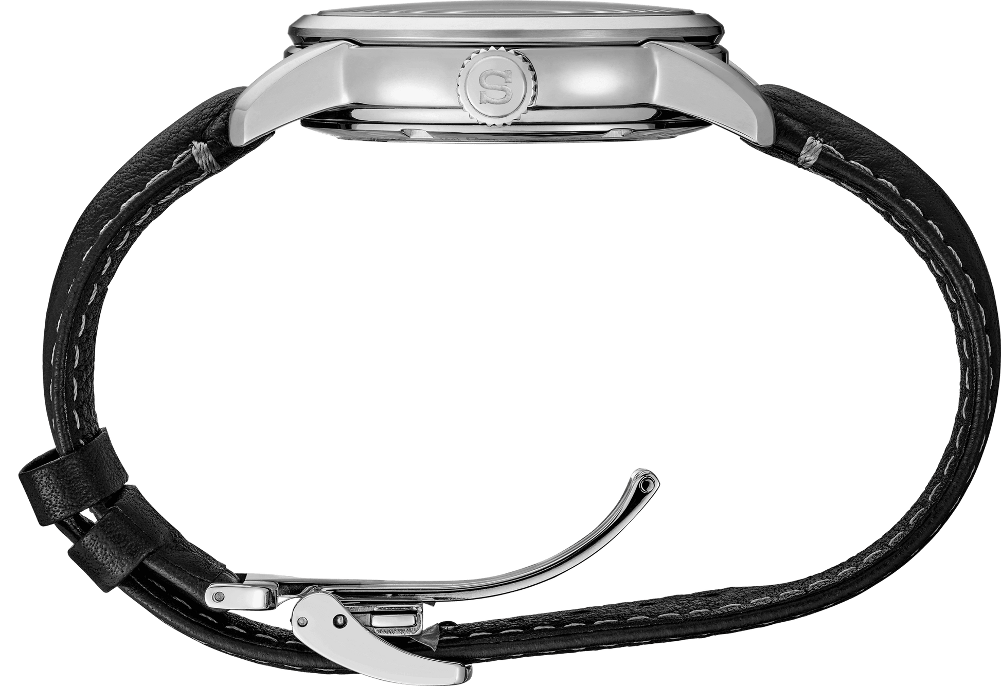 Presage Craftsmanship Series Enamel. Offering the finest in Japanese mechanical watchmaking, the Presage Collection blends precision technology with superior craftsmanship and design. In glossy white enamel with blue accents, the beautifully finished dial features a 24-hour subdial at 6 o’clock and curved hands providing a soft, luxurious impression. The thin roman numerals give a minimal, elegant, and contemporary impression while the crescent accent at the end of the second hand symbolizes the moon, a traditional element of Japanese art. The 24-jewel automatic movement beats at a frequency of 21,600 vibrations per hour, with a power reserve of 72 hours and manual winding capability. Crafted of stainless steel with super-hard coating, and paired with a black leather strap, this extraordinary timepiece includes a dual-curved anti-reflective sapphire crystal and a tri-fold push-button release clasp. 10 bar, 100M Water Resistant