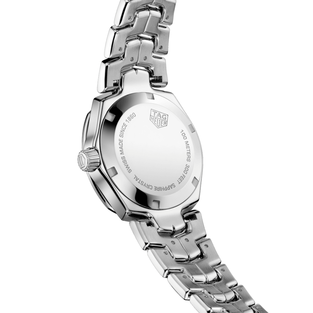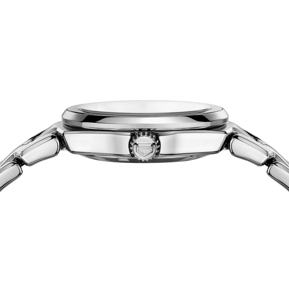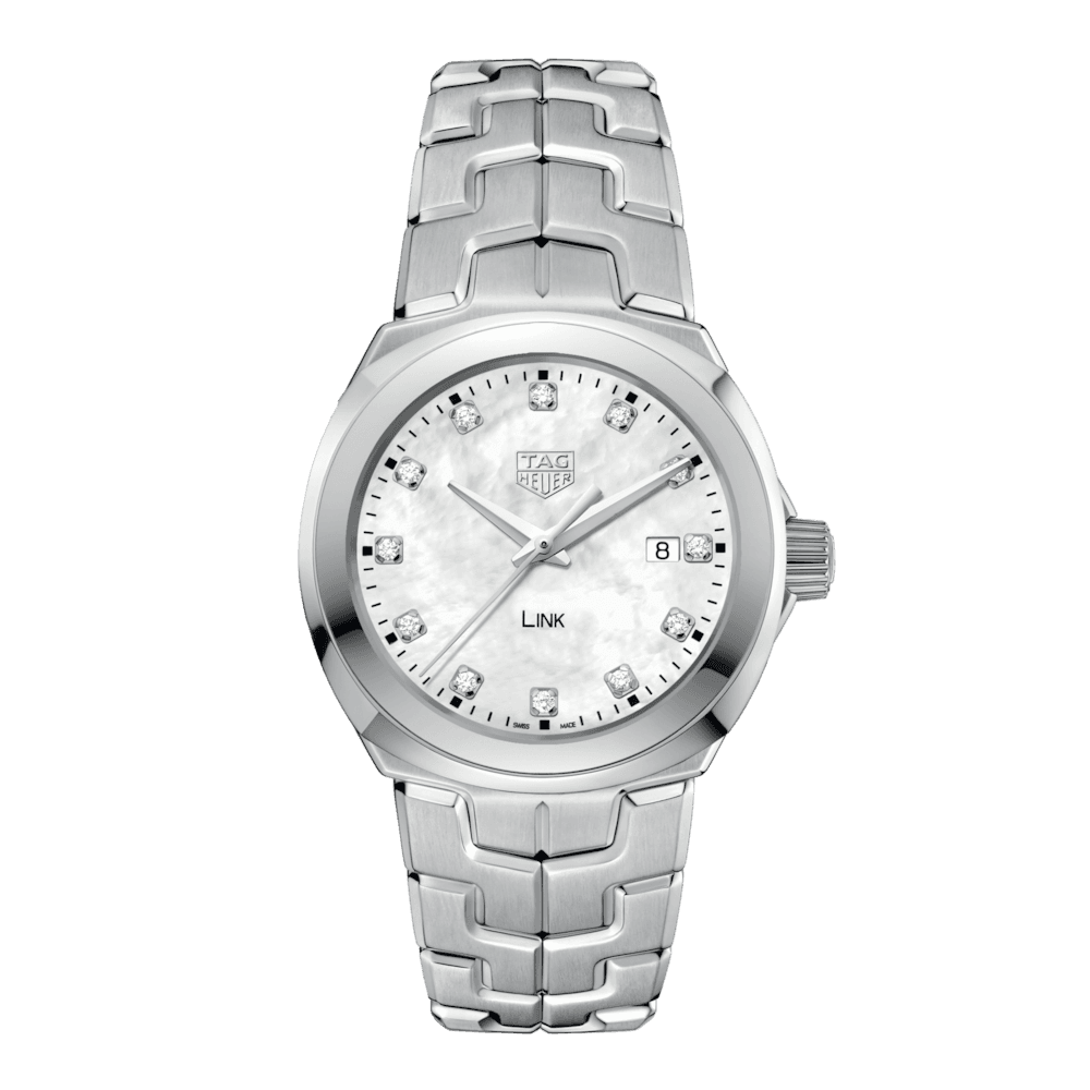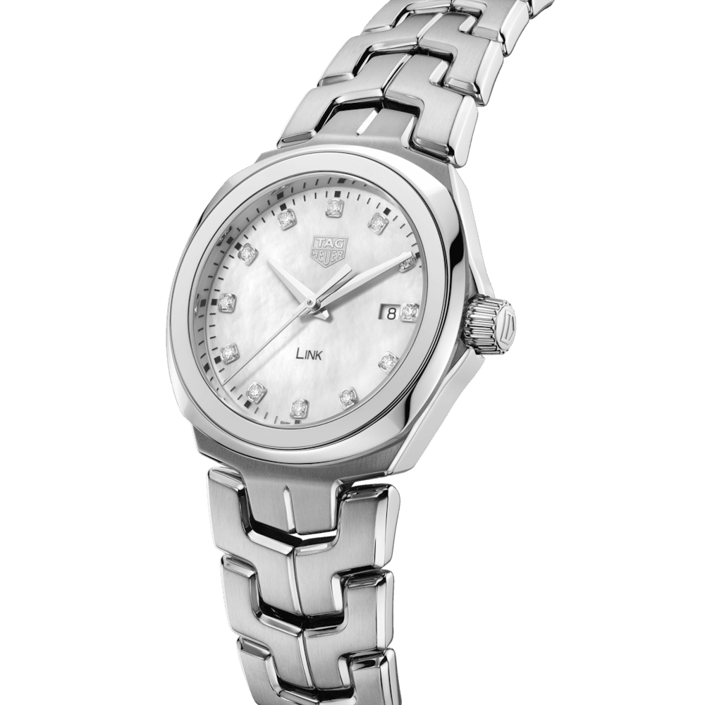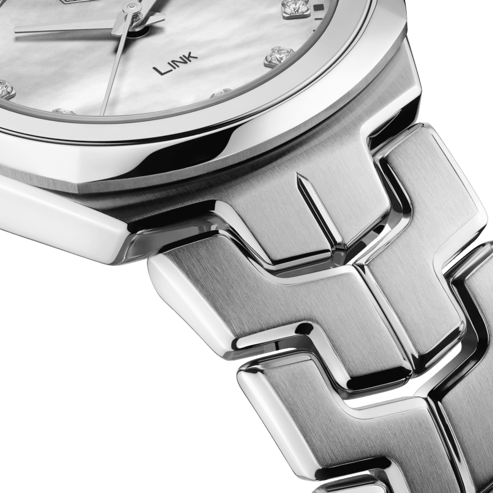 A stunning, very feminine, diamond (0.116 CT) quartz edition of the Link Lady with white mother-of-pearl dial. The slender, 32mm case in fine-brushed and polished stainless steel, matched with a polished steel bezel and the iconic S-shape bracelet.