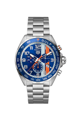 Bold and energetic, this chronograph makes a lasting impression of the legendary partnership between TAG Heuer and Gulf. Sporting Gulf’s emblematic blue and orange livery, this racing-inspired 43mm watch is ready to outpace with style.